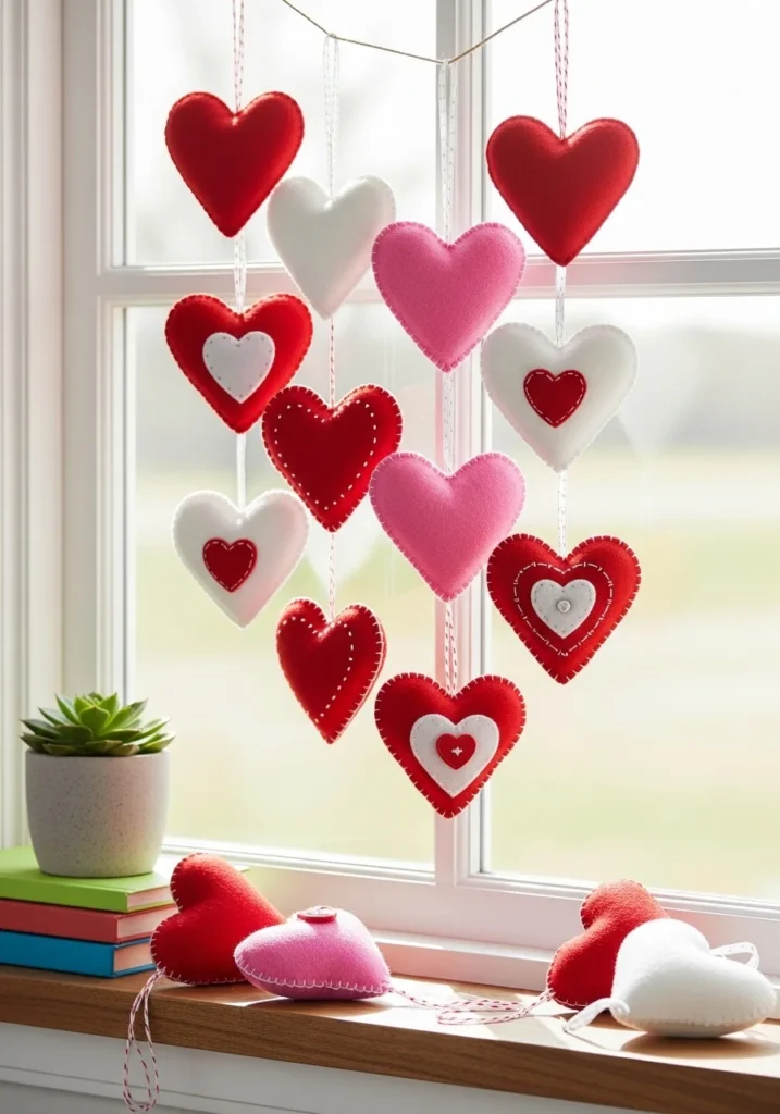 Felt heart hanging ornaments bring a soft, tactile charm to Valentine’s décor. Lightweight and easy to make, these ornaments can be strung individually or in clusters, adding movement and dimension to windows, shelves, or wall hooks. Their plush texture and gentle colors create a playful, inviting atmosphere.