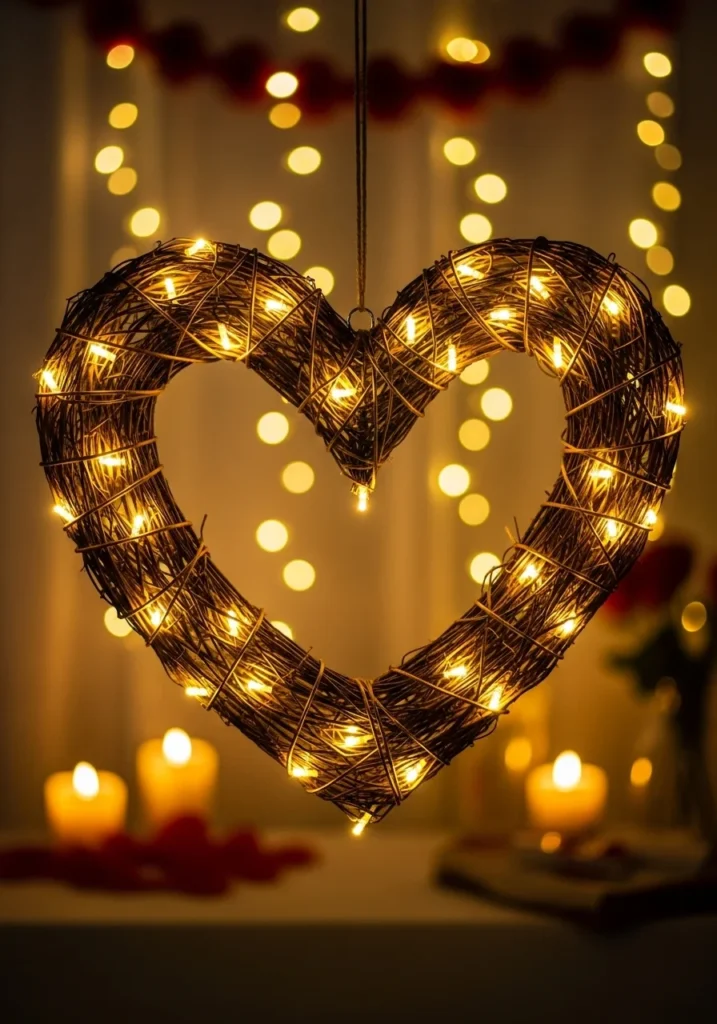 A heart-shaped garland combined with string lights creates a warm, glowing focal point for Valentine’s décor. The interplay of soft illumination and festive heart shapes instantly transforms any room into a romantic and inviting space. Draping the garland across mantels, windows, or walls adds both height and dimension.