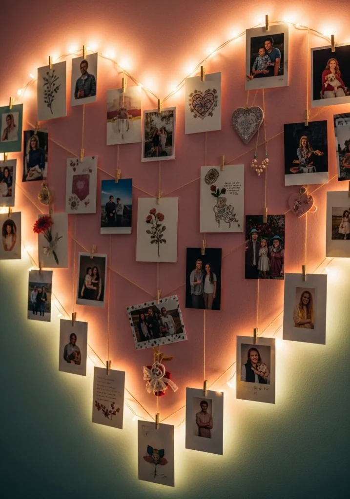 13. Heart-themed photo display wall with clips, cards, and DIY embellishments