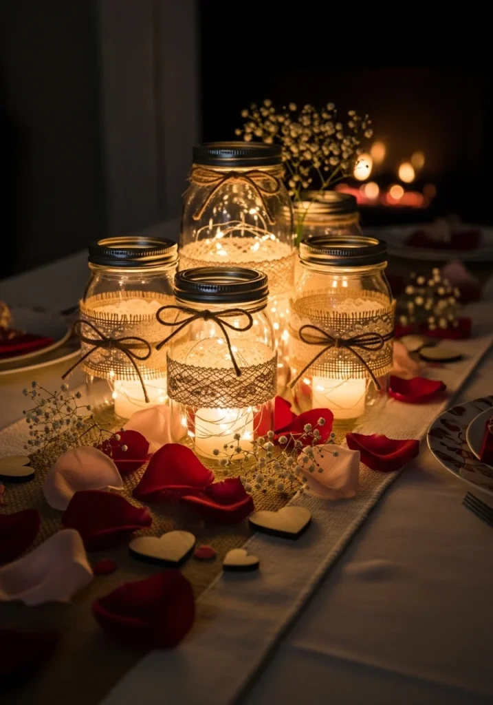 Layering jars of different heights and sizes creates visual interest and dimension, while the warm glow of candlelight or string lights enhances intimacy. Natural textures such as twine, burlap, or ribbon add depth and complement both modern and rustic décor styles. Decorative hearts on the jars reinforce the Valentine theme without overwhelming the design.