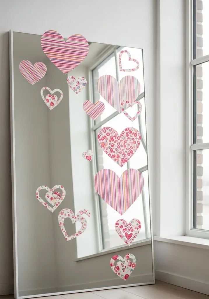 12. Washi tape heart designs on walls, mirrors, or glass for temporary, easy décor