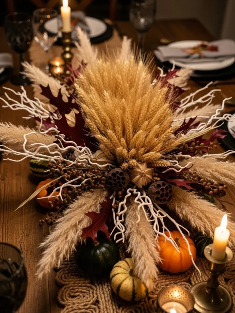 23. Thanksgiving centerpiece ideas featuring wheat, pampas grass, and dried elements