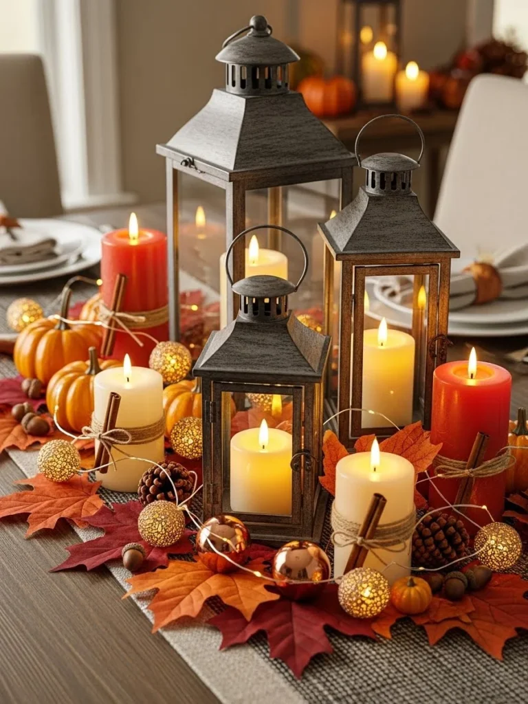 15. Thanksgiving centerpiece ideas using lanterns, candles, and glowing décor
