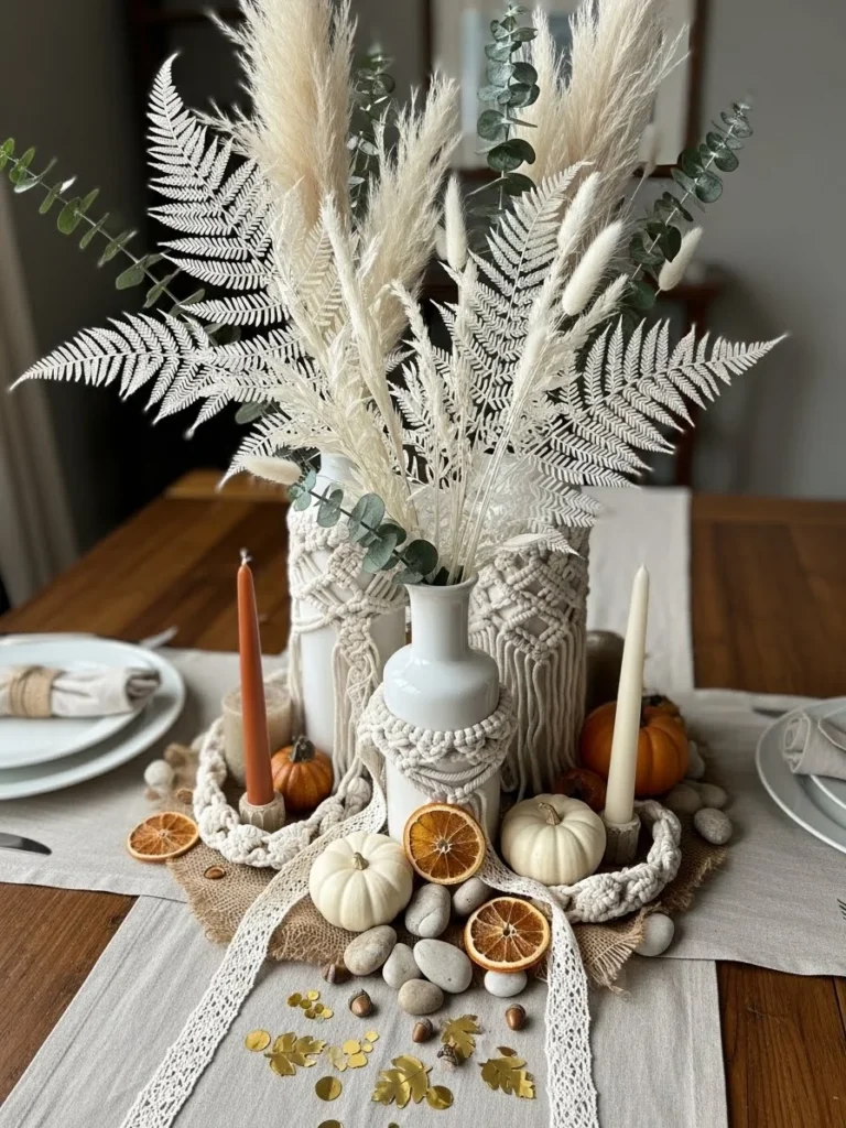 17. Thanksgiving centerpiece ideas with boho flair and layered natural textures