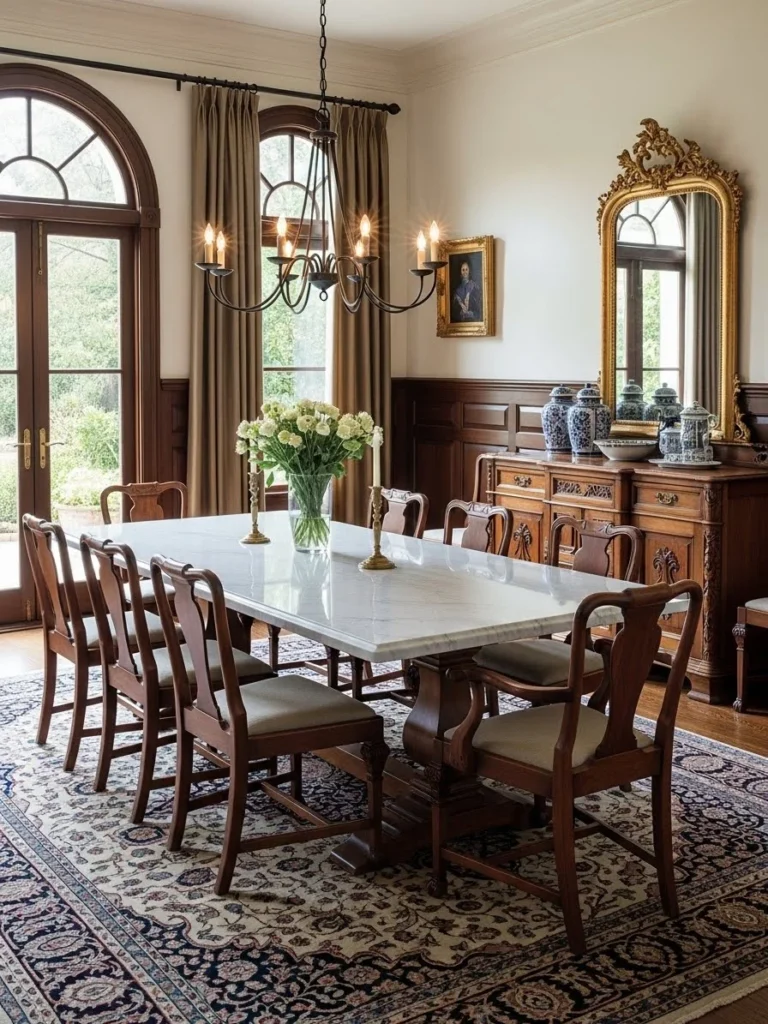 A dining room that blends a marble table with traditional wood accents combines timeless sophistication with modern functionality. The marble surface provides a sleek, polished centerpiece that exudes luxury, while wooden elements—such as chair frames, cabinetry, or trim—add warmth and grounding to the space.