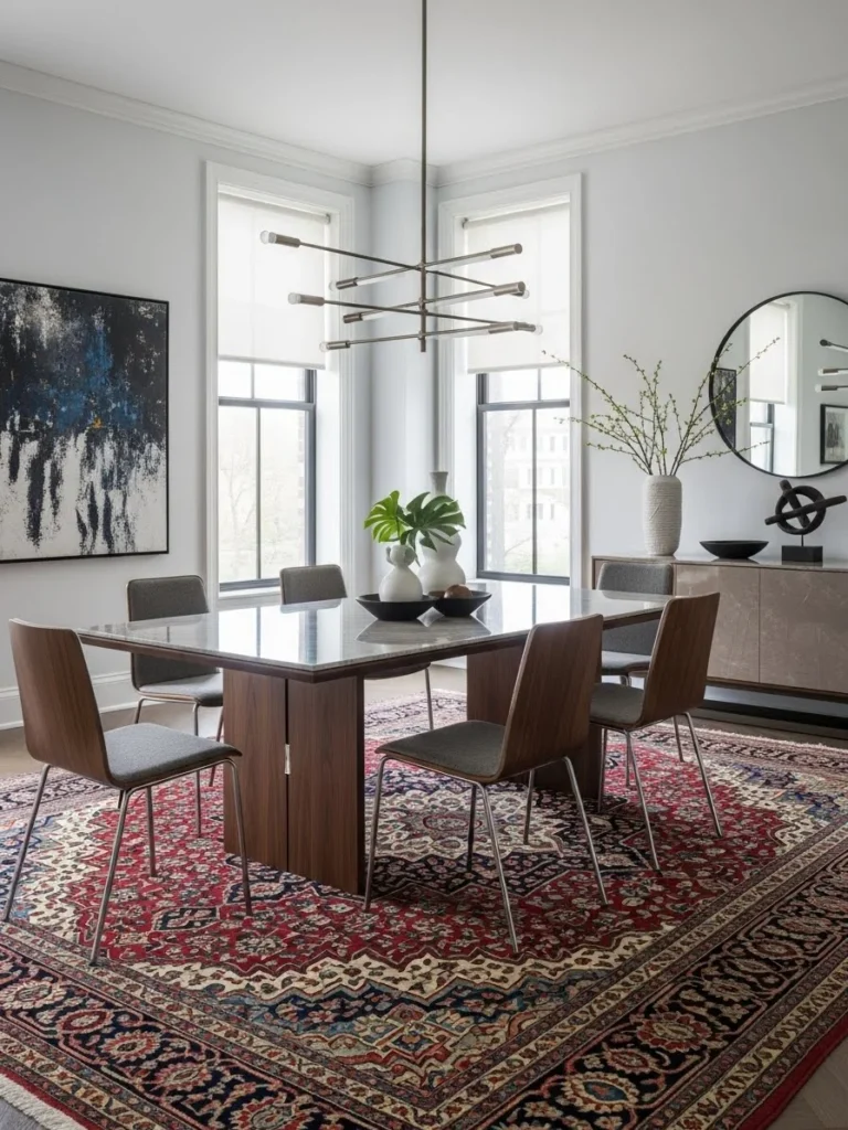 The juxtaposition of traditional rugs with modern furniture emphasizes contrast while maintaining cohesion. Wood, glass, or metal tables and neutral-toned chairs complement the intricate patterns of the rugs, creating a layered and sophisticated look.