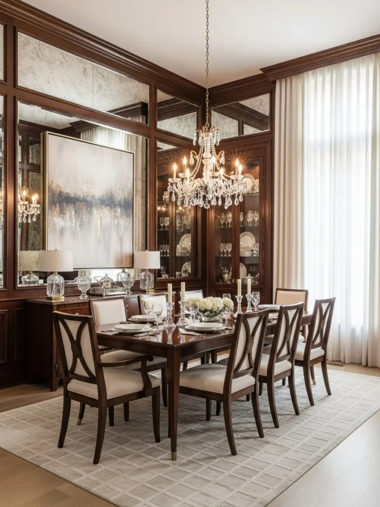Perfect for enhancing elegance and creating a sense of luxury, mirror-backed walls elevate the dining room into a refined and inviting environment. They balance modern functionality with traditional charm, making the space suitable for formal entertaining and everyday use.
