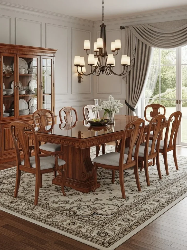 Combining classic rug patterns with modern furniture creates a harmonious modern traditional dining room that balances tradition and contemporary design. Oriental, Persian, or geometric rugs introduce warmth, texture, and visual interest, serving as a foundation for sleek dining tables and minimalist chairs.