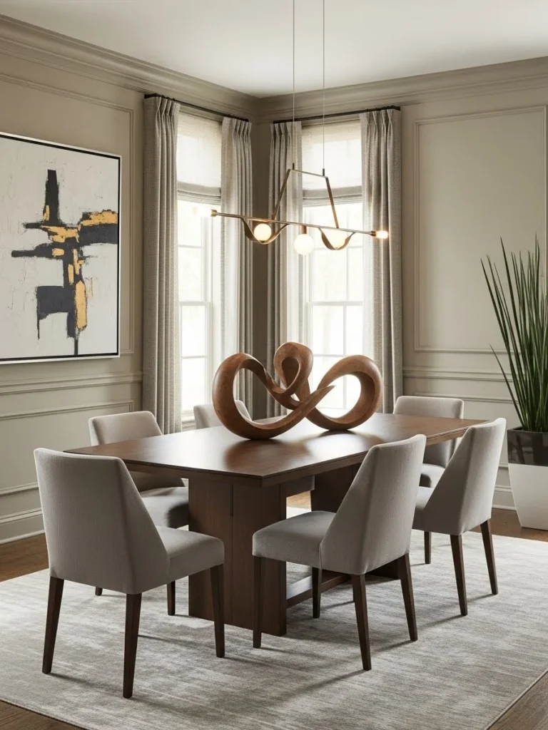 Modern sculptural elements can be paired with traditional dining tables and chairs, creating a harmonious balance of contemporary artistry and timeless design. Materials such as metal, glass, or ceramic enhance texture and contrast, while size and scale ensure proportionality within the room.