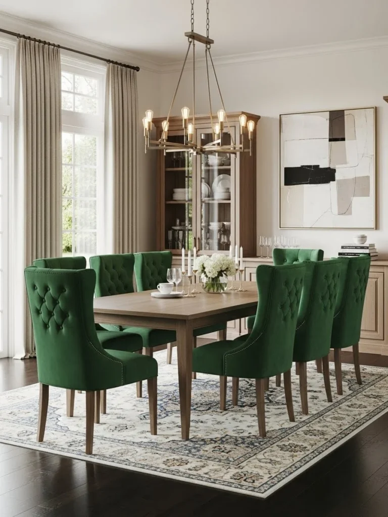 Perfect for modern traditional interiors, velvet dining chairs elevate the space without overwhelming it. They create a formal yet inviting atmosphere, suitable for entertaining guests or enjoying daily meals. Their combination of elegance, texture, and comfort ensures the dining room is stylish, functional, and welcoming.