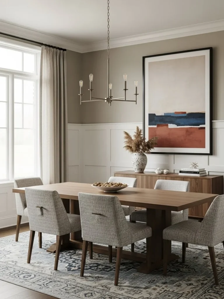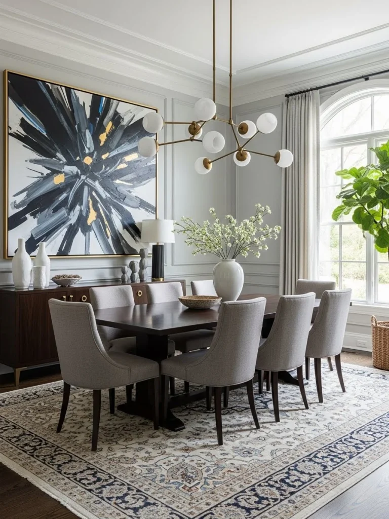 Statement artwork and lighting bring personality and drama to a modern traditional dining room. Bold paintings, sculptural pieces, or large wall art provide a contemporary focal point, while carefully chosen lighting fixtures enhance ambiance and highlight design details.