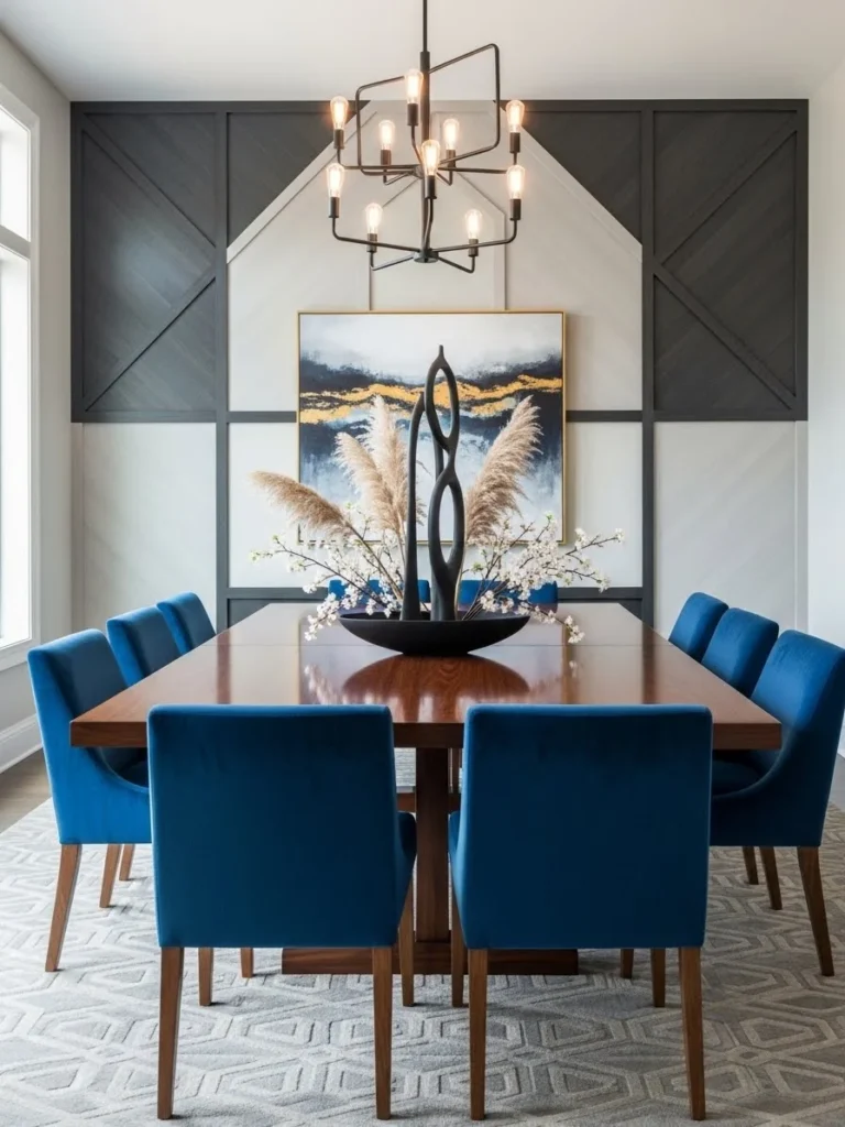 Statement wall paneling adds depth, texture, and architectural interest to a modern traditional dining room. Raised panels, wainscoting, or decorative moldings create a visual focal point, emphasizing elegance and sophistication while enhancing the room’s overall structure.