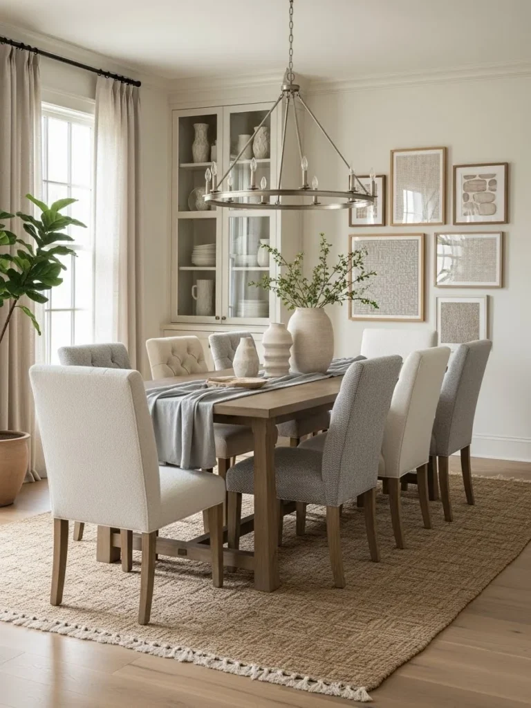 Neutral-toned modern traditional dining rooms emphasize tranquility, balance, and timeless elegance. A palette of soft creams, taupes, grays, and muted tones provides a versatile backdrop that highlights both traditional architectural details and contemporary furniture pieces.