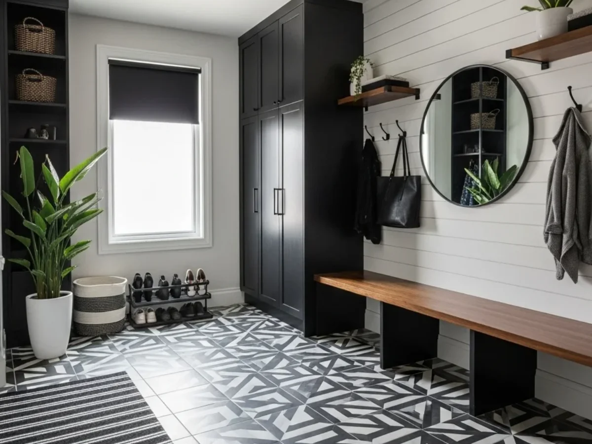 Sleek Black-and-White Mud Room with Geometric Tile Flooring