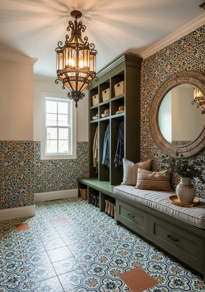 Artistic Mud Room Design with Colorful Tiles and Statement Lighting