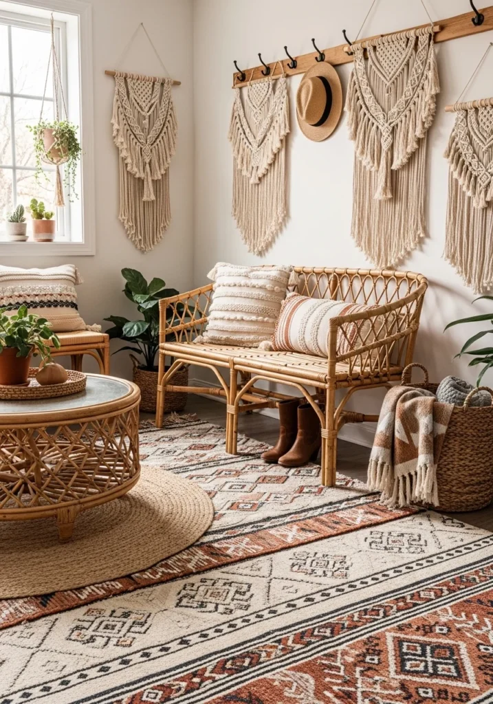 Boho Mud Room with Rattan Furniture, Macramé Art, and Layered Rugs
