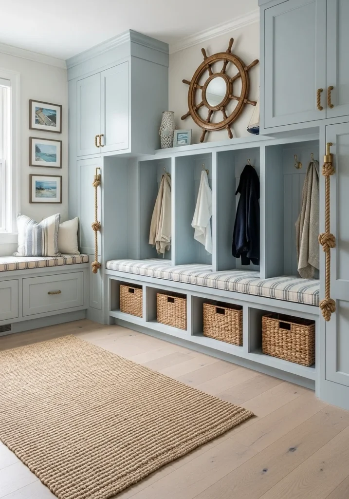 Coastal-Inspired Mud Room with Light Blue Cabinetry and Rope Details