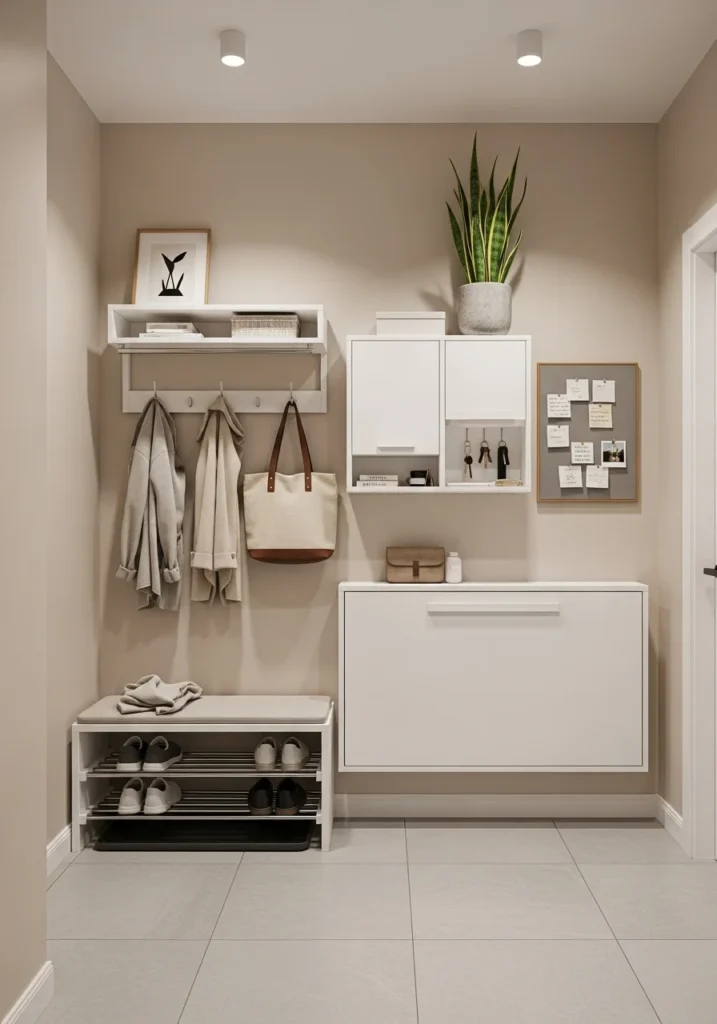 A foldable bench provides comfortable seating when needed and folds away effortlessly for a clutter-free look. Wall-mounted organizers, magnetic strips, and slim shelving create vertical storage solutions that keep daily essentials tidy and accessible. Bright colors or mirrors can visually expand the area, making it feel more open and inviting.