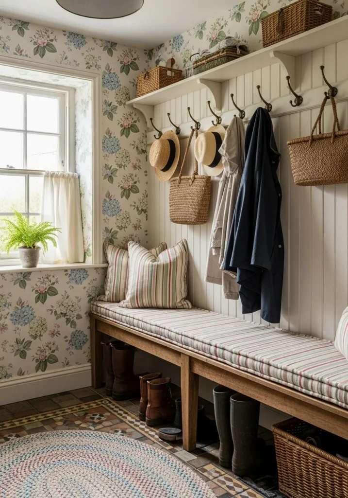 Cozy Cottage Mud Room with Floral Wallpaper and Vintage Hooks