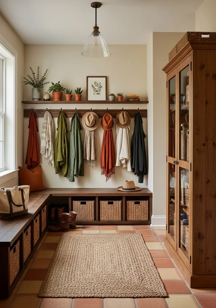 This warm palette of rusts, browns, and neutrals creates a soothing, lived-in ambiance. The earthy mud room feels timeless and comforting, offering a peaceful transition between the outdoors and your interior sanctuary.