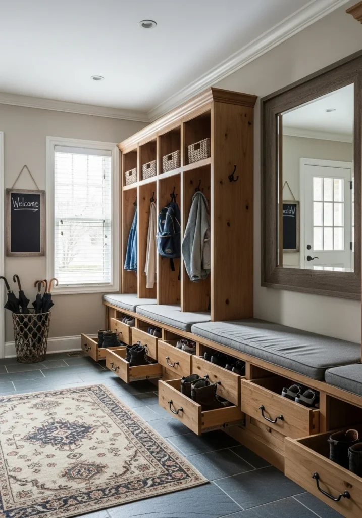 Every feature in this mud room is designed with intent and innovation. It’s proof that small spaces can still feel spacious, elegant, and effortlessly functional.