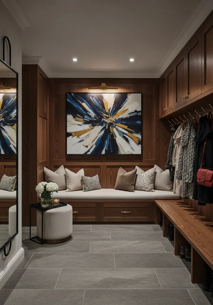 Hotel-Inspired Mud Room with Built-In Seating and Statement Art