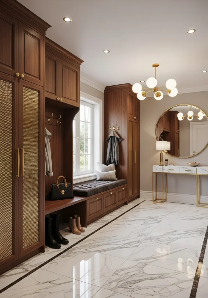 A luxury mud room with marble flooring and gold hardware embodies timeless sophistication. Every element is carefully curated to elevate functionality into an experience of refined comfort.