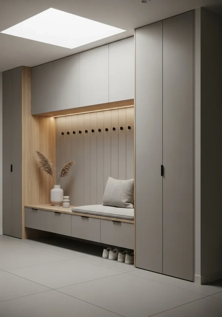 Hidden cabinetry ensures all essentials — shoes, bags, and coats — are tucked neatly away, maintaining a polished, clutter-free aesthetic. The smooth surfaces and handleless doors amplify the minimalist feel, while built-in LED lighting provides both visibility and ambiance. The result is a space that looks as sophisticated as it is practical.