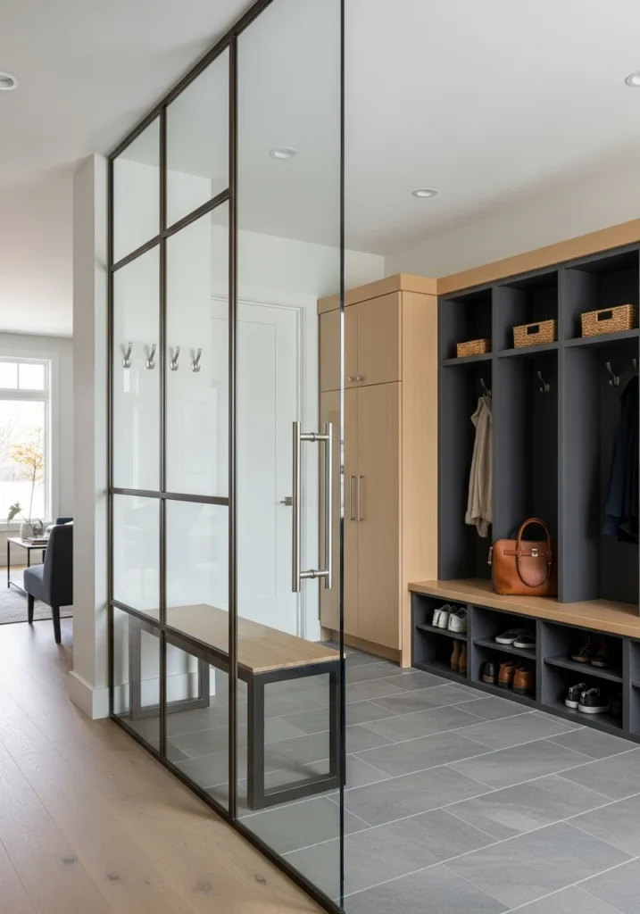 An open-concept mud room blurs the boundary between entryway and living space, creating a fluid, contemporary design. The use of glass partitions introduces transparency, allowing light to pass freely while subtly defining zones.