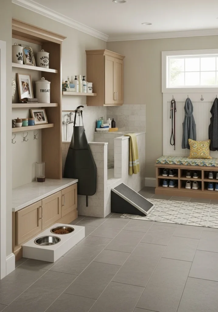 Pet-Friendly Mud Room with Built-In Feeding Station and Dog Wash Area