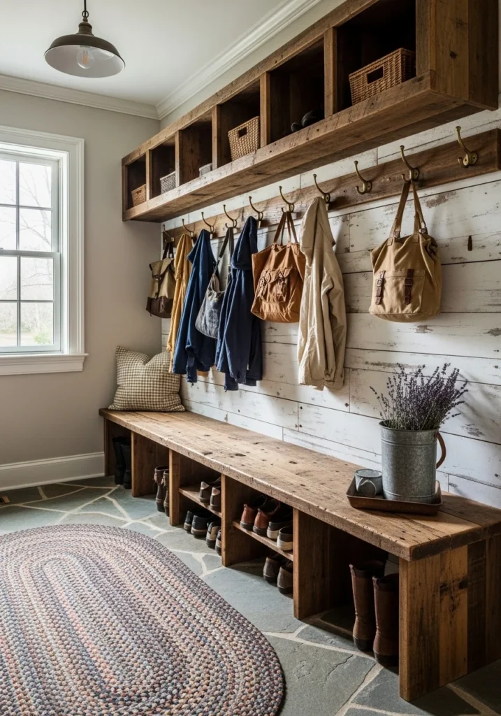 A reclaimed wood bench anchors the space, offering durability and rustic appeal. Shiplap walls painted in white or soft neutrals enhance the farmhouse aesthetic, while woven baskets and metal hooks keep the space organized and authentic.