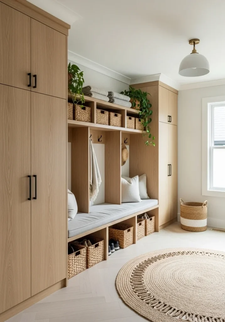 Scandinavian-Inspired Mud Room with Light Wood and Woven Baskets