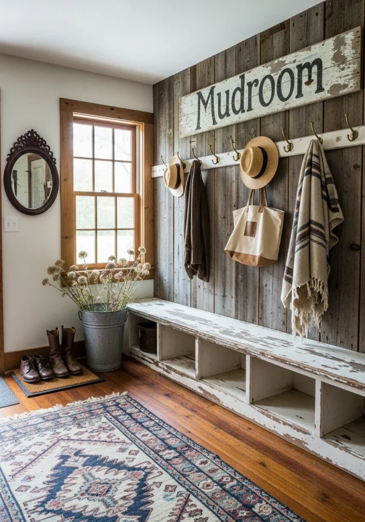 Vintage Farmhouse Mud Room with Distressed Finishes and Antique Décor