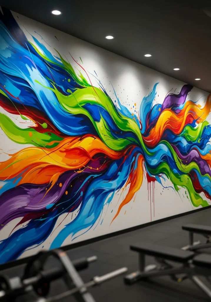 Abstract art gym walls introduce fluid shapes, bold colors, and dynamic compositions to energize a fitness environment. These visually stimulating designs encourage creativity, movement, and focus while transforming the gym into an inspiring space that promotes engagement and performance.