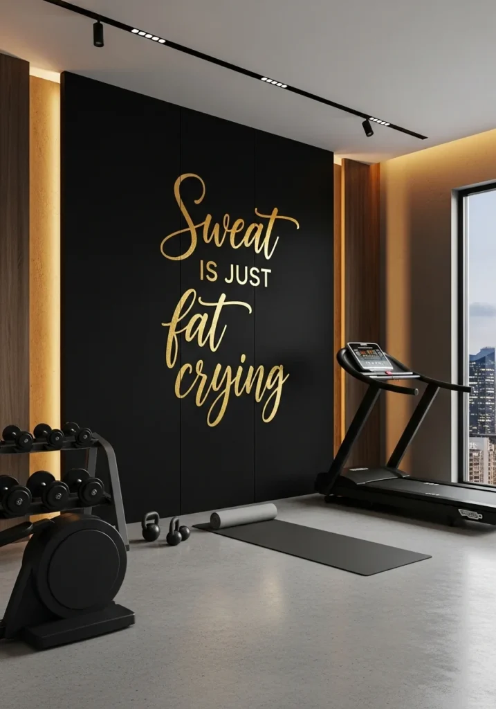 Ideal for modern home gyms or high-end boutique studios, this design elevates the space by combining motivational messaging with contemporary luxury aesthetics. It balances elegance, clarity, and inspiration, turning a simple wall into a powerful visual and psychological anchor for fitness environments.