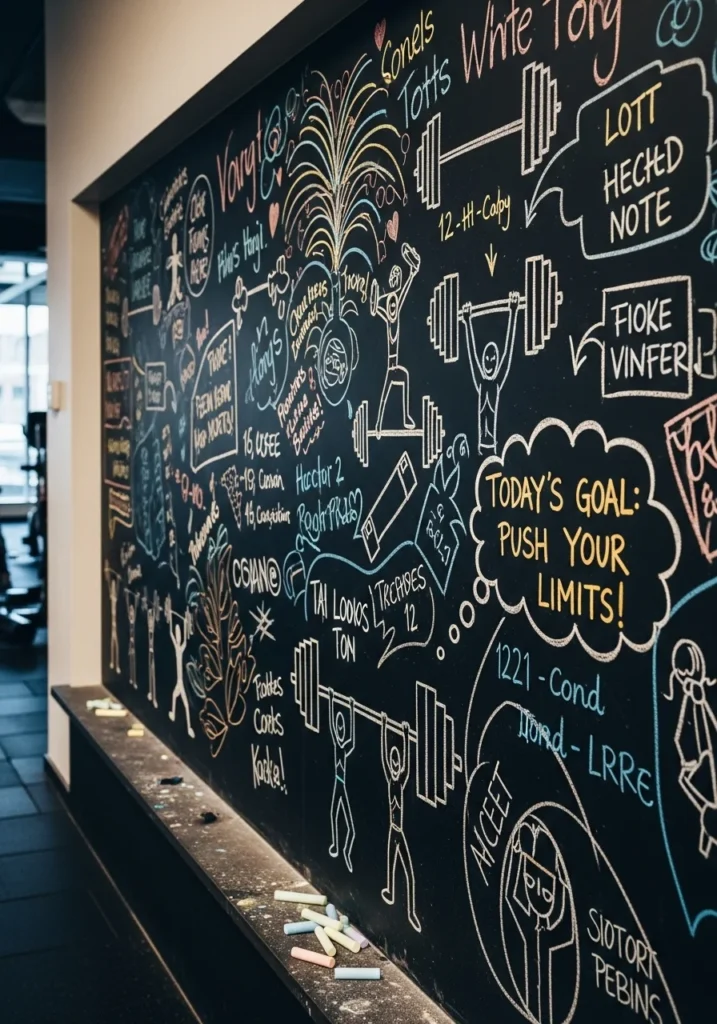 A chalkboard wall in a gym introduces interactivity, creativity, and functional organization. Users can write daily workouts, motivational phrases, or progress goals directly onto the wall, creating a dynamic and adaptable fitness space. This hands-on approach encourages engagement and accountability.