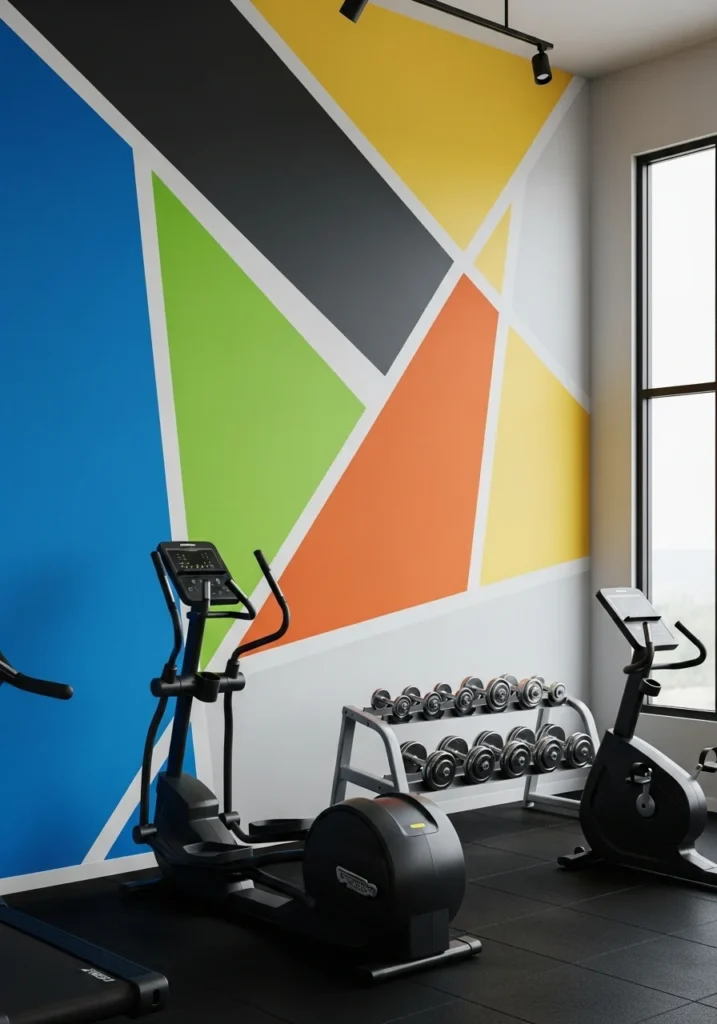 A color-blocked gym wall introduces bold geometric sections to create a visually striking and energizing workout space. Contrasting hues, angular shapes, and carefully balanced composition foster motivation, focus, and an elevated sense of energy. This modern design complements contemporary interiors while defining the gym’s personality.