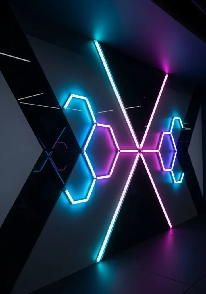A futuristic gym wall with LED strips and dynamic lighting transforms the space into an immersive, high-tech workout environment. Programmable patterns, color-changing effects, and motion-responsive lighting elevate energy, create visual excitement, and stimulate focus during exercise. This cutting-edge approach combines interior design with technology to inspire peak performance.