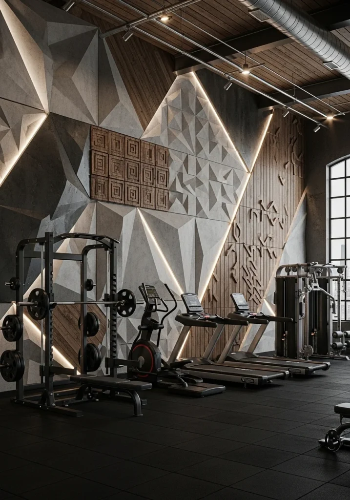 A gym wall featuring 3D textured panels introduces architectural depth, tactile interest, and a contemporary industrial aesthetic. Textured surfaces break the monotony of flat walls, creating visual intrigue while reinforcing a modern, high-performance environment. The design combines rugged sophistication with practical gym functionality.