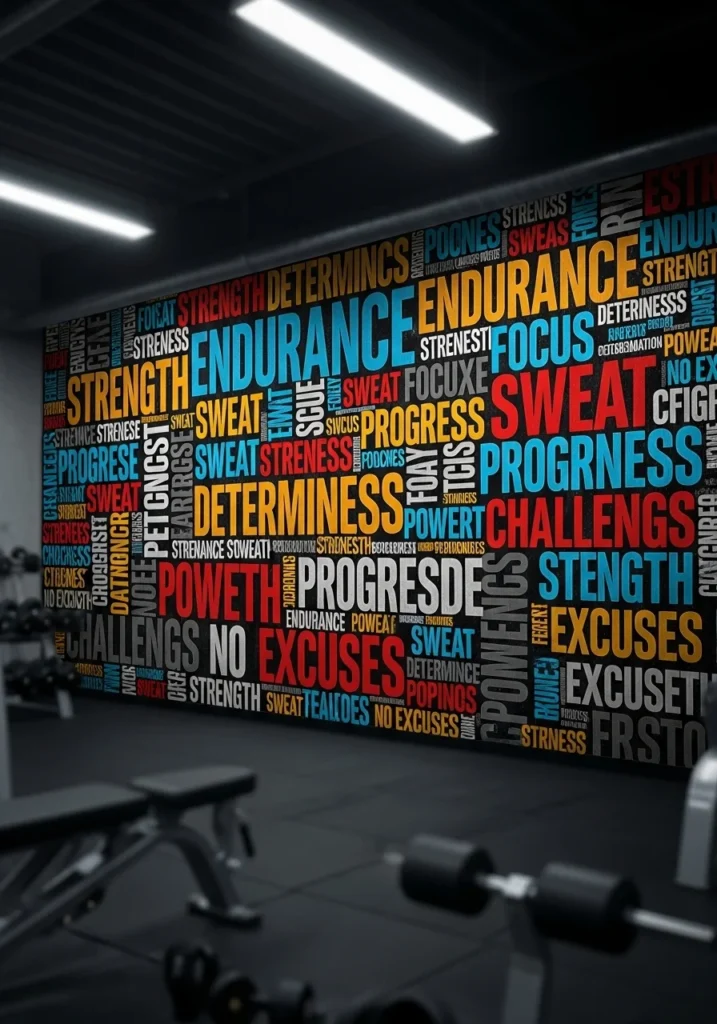 A word cloud gym wall merges creativity, motivation, and visual engagement to energize any fitness environment. Mixed fonts, varied sizes, and bold placements highlight key words such as “Strength,” “Focus,” or “Endurance,” creating a dynamic and high-energy visual that encourages users to push their limits.