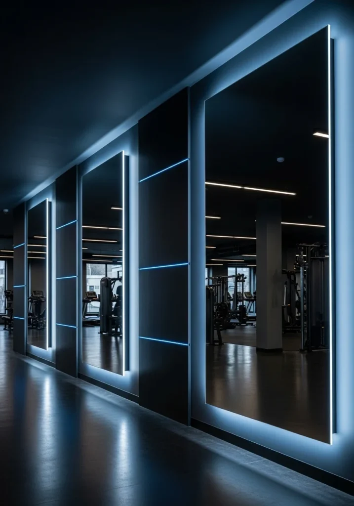 A gym wall with large mirrors and integrated LED backlighting maximizes spatial perception, natural light reflection, and visual energy. Mirrors enhance the sense of openness, allowing users to monitor posture and form while amplifying the perception of space. LED backlighting introduces a futuristic, high-tech vibe that elevates the workout environment.