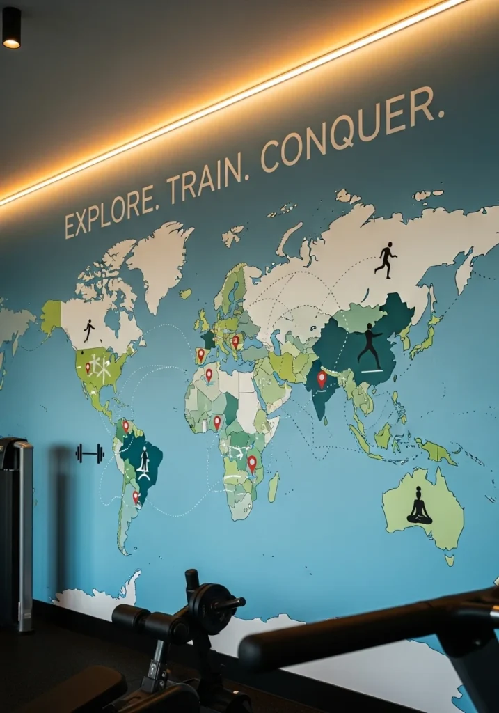 Ideal for home gyms or boutique studios seeking both inspiration and style, this concept combines motivation, creativity, and contemporary design. By linking physical fitness with exploration and achievement, the world map mural fosters both mental engagement and aesthetic appeal, transforming a simple wall into an aspirational, energizing feature that encourages users to push boundaries.