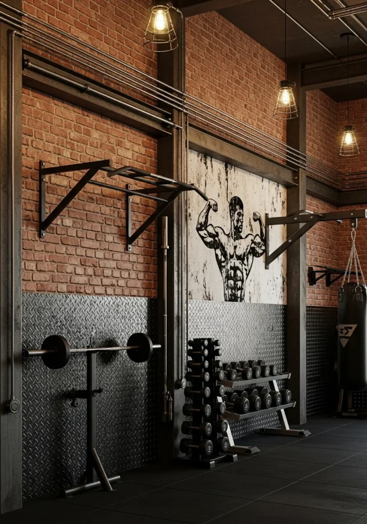 02. Industrial-style gym wall with exposed brick, metal accents, and urban fitness aesthetic