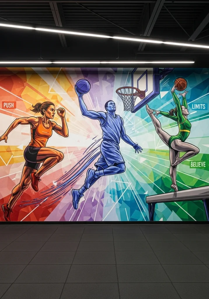 Inspirational athlete murals bring movement, energy, and motivation to a gym environment. Depicting athletes in dynamic poses—running, lifting, or stretching—these murals visually convey strength, determination, and endurance. They serve as constant reminders of discipline and athletic achievement, inspiring users to push their limits.