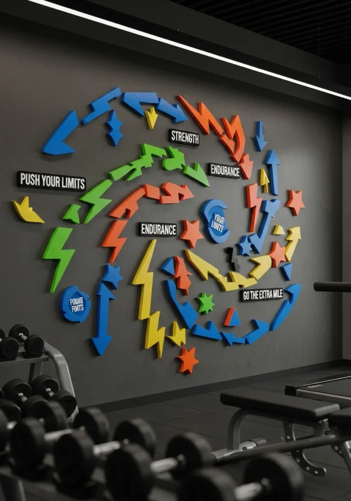 Careful composition ensures balance and readability while supporting the flow of movement across the space. Color choices, typography variations, and layout enhance impact without overwhelming the eye. The wall can also be updated over time, making it adaptable for new themes or motivational messages.