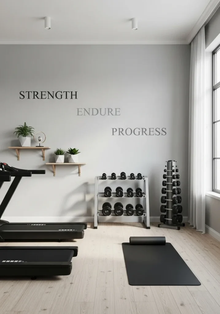 Minimal typographic gym walls combine subtle elegance with motivation, emphasizing clean lines, neutral tones, and Scandinavian-inspired simplicity. Carefully chosen words—like “Strength,” “Focus,” or “Consistency”—provide inspiration without overwhelming the visual space, creating a calm, purposeful environment.