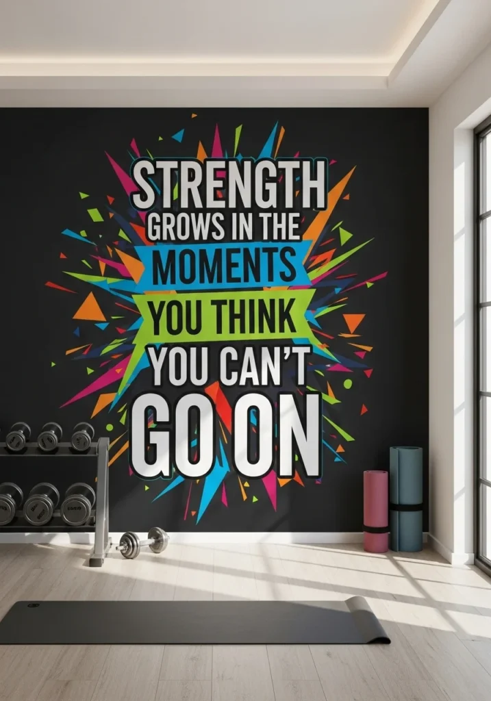 Typography, font weight, and gradient transitions are carefully selected to maintain readability while maximizing aesthetic appeal. Neon or LED lighting effects highlight the wall, casting subtle reflections that energize the room and complement modern gym interiors. Strategic placement ensures the motivational message remains central and visible.