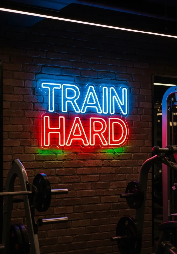 12. Neon sign wall art in gym, “Train Hard” or custom phrases, trendy energetic lighting