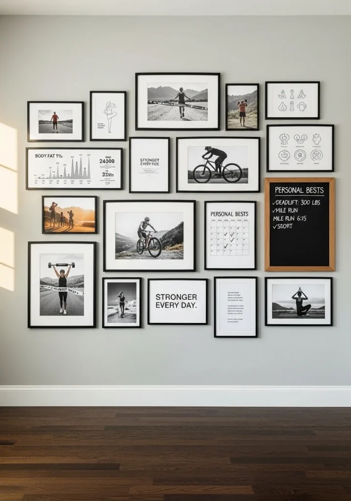 08. Personalized home gym wall gallery, framed photos, progress tracking, stylish arrangement