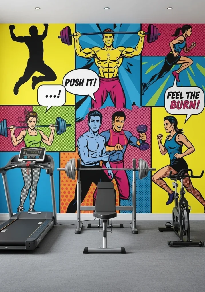 Ideal for home gyms or commercial fitness studios targeting younger or trend-conscious audiences, this decor style balances art and functionality. By combining bold aesthetics with motivational energy, the pop-art wall decor elevates the gym environment, fostering enthusiasm, creativity, and consistent performance. It demonstrates how artistic expression can seamlessly enhance physical fitness spaces.